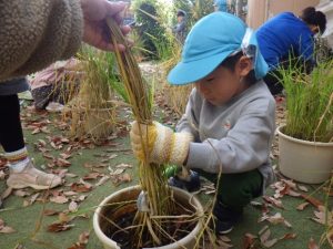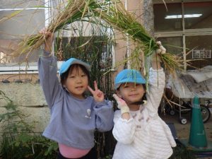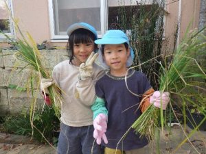 最後に、収穫した稲と一緒ににっこりピース☆で写真を撮りました。